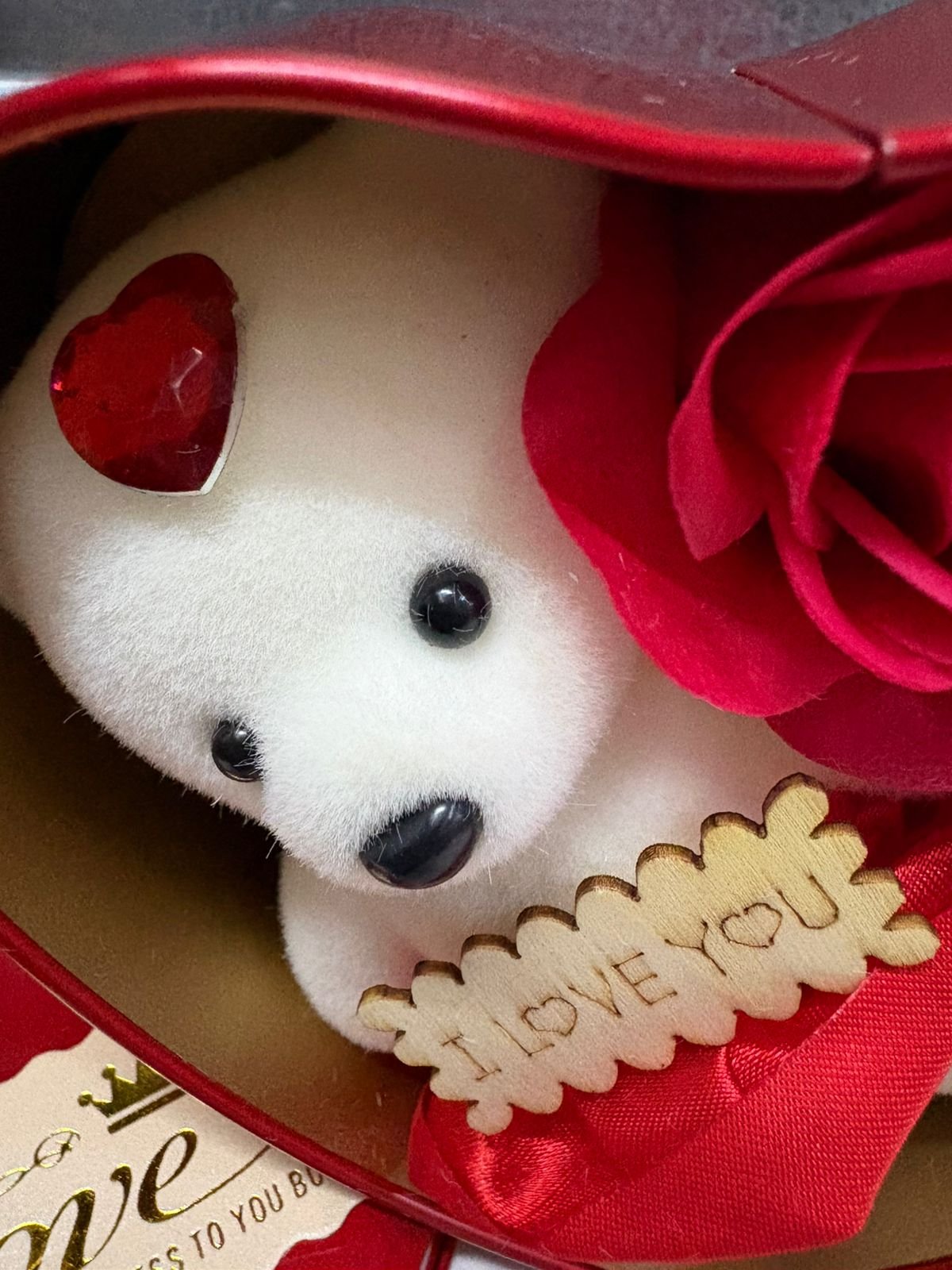 El estuche, elaborado en metal resistente, no solo protege su contenido, sino que también destaca por su acabado elegante que añade un toque de sofisticación al regalo. Dentro, encontrarás un adorable mini osito de peluche, cuidadosamente seleccionado por su suavidad y capacidad para transmitir emociones. Además, las 3 rosas que acompañan al peluche están dispuestas estratégicamente para realzar la estética del conjunto, creando un equilibrio perfecto entre lo delicado y lo sofisticado.