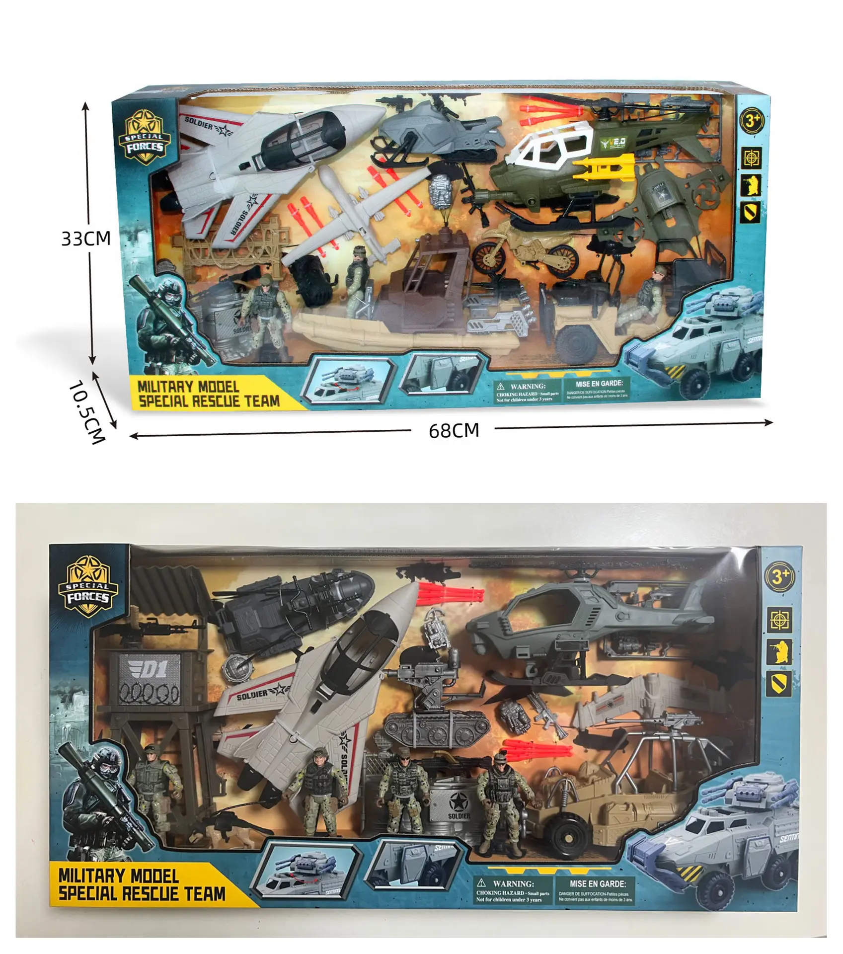 Prepárate para sorprender con este mega set militar de rescate especial, repleto de vehículos, soldados y accesorios que harán que la imaginación de los niños se dispare como nunca. Con aviones, helicópteros, camionetas blindadas, lanchas y figuras articuladas, este set es perfecto para recrear misiones, rescates extremos y batallas estratégicas.